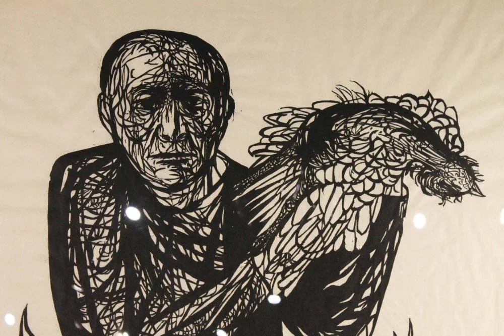 The pane of our bedroom window cast a cross-shaped shadow across the thing’s body as it rose. Ribs showed through paper-thin skin. Blood ran down its chest, bulged over its round belly, and congealed in white pubic hair. There was something in one of its hands: a mass of feathers and flesh and broken bone. I could smell it rotting.